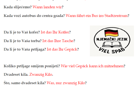 Htio / Htjela bih rezervirati let za Atenu. Ich möchte einen Flug nach Athen buchen. Da li je to direktan let? Ist das ein Direktflug? Molim mjesto do prozora, za nepušače. Bitte einen Fensterplatz, Nichtraucher. Htio / Htjela bih promijeniti svoju rezervaciju. Ich möchte meine Reservierung ändern. Kada polijeće […]