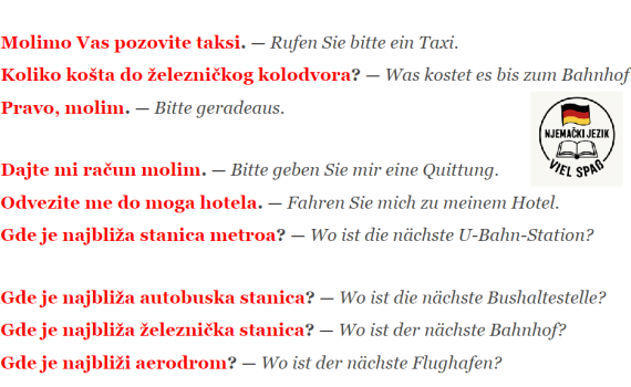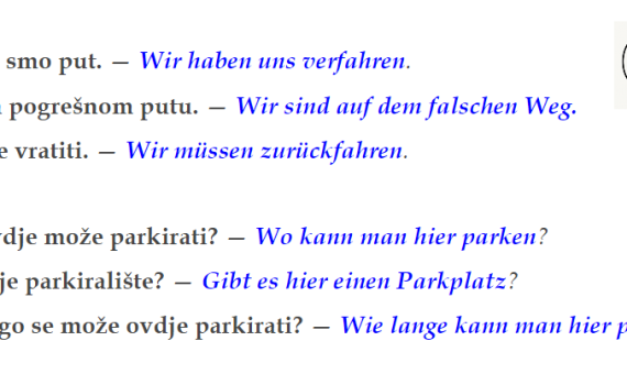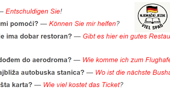 Izvinite! — Entschuldigen Sie! Možete li mi pomoći? — Können Sie mir helfen? Gdje ovdje ima dobar restoran? — Gibt es hier ein gutes Restaurant? Kako da dođem do aerodroma? — Wie komme ich zum Flughafen? Gdje je najbliža autobuska stanica? — Wo ist die nächste Bushaltestelle? Koliko košta […]