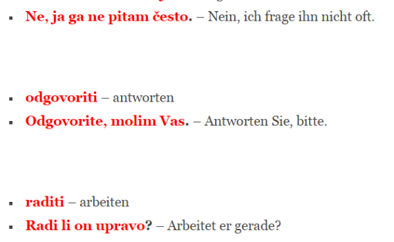 učiti – lernen Uče li učenici puno? – Lernen die Schüler viel? Ne, uče malo. – Nein, sie lernen wenig. pitati – fragen Pitate li često učitelja? – Fragen Sie oft den Lehrer? Ne, ja ga ne pitam često. – Nein, ich frage ihn nicht oft. odgovoriti – […]