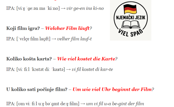 Idemo u kino. – Wir gehen ins Kino. IPA: [viːɐ̯ ˈɡeːən ɪns ˈkiːno] → vir ge-en ins ki-no Koji film igra? – Welcher Film läuft? IPA: [ˈvɛlçɐ fɪlm laʊ̯ft] → velher film lauf-t Koliko košta karta? – Wie viel kostet die Karte? IPA: [viː fiːl ˈkɔstət diː ˈkaʁtə] […]