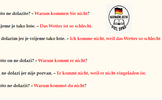 etwas begründen – nešto obrazložiti Zašto ne dolazite? – Warum kommen Sie nicht? Vrijeme je tako loše. – Das Wetter ist so schlecht. Ne dolazim jer je vrijeme tako loše. – Ich komme nicht, weil das Wetter so schlecht ist. Zašto on ne dolazi? – Warum kommt er nicht? On ne […]