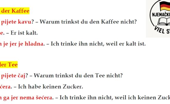 nešto opravdati – etwas begründen Torta / die Torte Zašto ne jedete tortu? – Warum essen Sie die Torte nicht? Moram smršaviti. – Ich muss abnehmen. Ne jedem ju jer moram smršaviti. – Ich esse sie nicht, weil ich abnehmen muss. Pivo / das Bier Zašto ne pijete […]