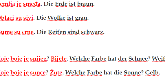Snijeg je bijel. Der Schnee ist weiß. Sunce je žuto. Die Sonne ist gelb. Narandža je narandžasta. Die Orange ist orange. Trešnja je crvena. Die Kirsche ist rot. Nebo je plavo. Der Himmel ist blau. Trava je zelena. Das Gras ist grün. Zemlja je smeđa. Die Erde ist […]