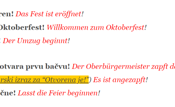 Festival je otvoren! Das Fest ist eröffnet! Dobrodošli na Oktoberfest! Willkommen zum Oktoberfest! Počinje parada! Der Umzug beginnt! Gradonačelnik otvara prvu bačvu! Der Oberbürgermeister zapft das erste Fass an! O’zapft is! (bavarski izraz za “Otvorena je!”) Es ist angezapft! Neka zabava počne! Lasst die Feier beginnen! Svi šatori […]