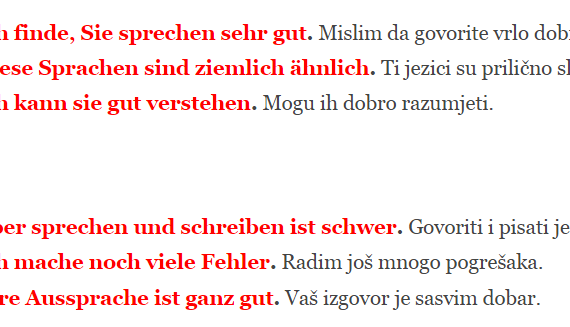 Wo haben Sie Spanisch gelernt? Gdje ste naučili španjolski? Können Sie auch Portugiesisch? Znate li i portugalski? Ich nicht, und ich kann auch etwas Italienisch. Ja ne znam ni nešto talijanski. Ich finde, Sie sprechen sehr gut. Mislim da govorite vrlo dobro. Diese Sprachen sind ziemlich ähnlich. Ti jezici […]
