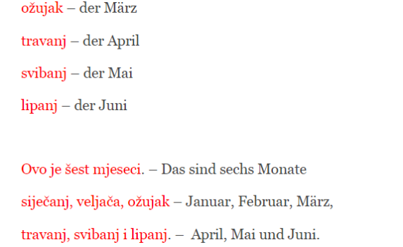 Prvih šest mjeseci – die ersten sechs Monate siječanj – der Januar veljača – der Februar ožujak – der März travanj – der April svibanj – der Mai lipanj – der Juni Ovo je šest mjeseci. – Das sind sechs Monate siječanj, veljača, ožujak – Januar, Februar, März, […]