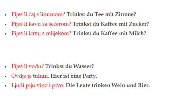 Ja pijem čaj. Ich trinke Tee. Ja pijem kavu. Ich trinke Kaffee. Ja pijem mineralnu vodu. Ich trinke Mineralwasser. Piješ li čaj s limunom? Trinkst du Tee mit Zitrone? Piješ li kavu sa šećerom? Trinkst du Kaffee mit Zucker? Piješ li kavu s mlijekom? Trinkst du Kaffee mit Milch? […]
