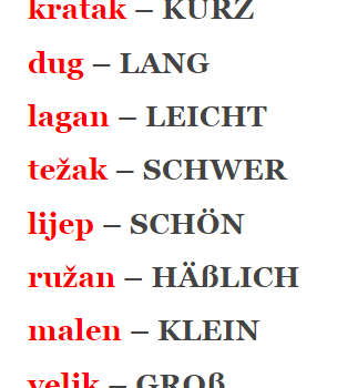 dobar – GUT zao – BÖSE kratak – KURZ dug – LANG lagan – LEICHT težak – SCHWER lijep – SCHÖN ružan – HÄßLICH malen – KLEIN velik – GROß mlad – JUNG star – ALT nizak – NIEDRIG visok – HOCH nov – NEU mudar – KLUG glup – […]