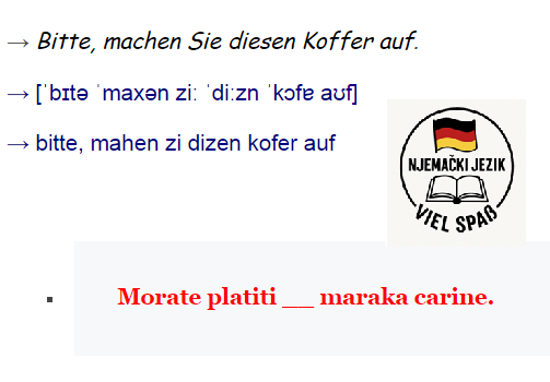 Nemam ništa za carinu. Ich habe nichts zu verzollen. [ɪç ˈhaːbə nɪçts tsuː fɛɐ̯ˈtsɔlən] ih habe nihts cu fercolen Imam samo lične stvari. Ich habe nur persönliche Sachen. [ɪç ˈhaːbə nuːɐ̯ pɛɐ̯ˈzøːnliçə ˈzaxən] ih habe nur perzenliše zašen Imate li vino, liker, šnaps? Haben Sie Wein, Likör, Schnaps? […]