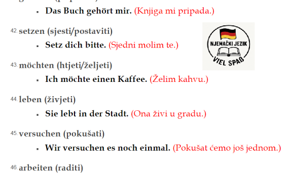 Popis 50 važnih glagola u njemačkom jeziku, zajedno s njihovim infinitivnim oblikom (osnovni oblik): sein (biti) Ich bin Student. (Ja sam student.) werden (postati) Er wird Arzt. (On postaje doktor.) haben (imati) Wir haben ein Auto. (Mi imamo auto.) können (moći) Du kannst gut singen. (Ti možeš dobro pjevati.) […]