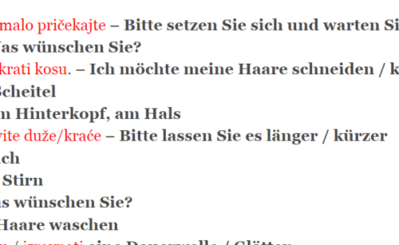 Izvolite sjesti i malo pričekajte – Bitte setzen Sie sich und warten Sie ein bisschen. Šta želite? – Was wünschen Sie? Želim osisati/skratiti kosu. – Ich möchte meine Haare schneiden / kürzen. na čelu – am Scheitel na zatiljku – am Hinterkopf, am Hals Molim da ostavite duže/kraće – Bitte […]