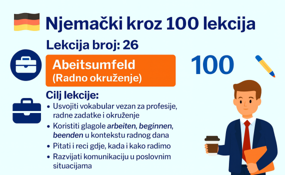 LEKCIJA 26 – Arbeitsumfeld (Radno okruženje) Cilj lekcije: Usvojiti vokabular vezan za profesije, radne zadatke i okruženje Koristiti glagole arbeiten, beginnen, beenden u kontekstu radnog dana Pitati i reći gdje, kada i kako radimo Razvijati komunikaciju u poslovnim situacijama 1. PRIČA: Das Arbeitsleben Hallo! Ich heiße Anna. Ich arbeite in […]