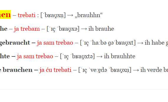 brauchen – trebati : [ˈbʁaʊ̯xn̩] → „brauhhn“ ich brauche – ja trebam – [ˈɪç ˈbʁaʊ̯xə] → ih brauhe ich habe gebraucht – ja sam trebao – [ˈɪç ˈhaːbə ɡəˈbʁaʊ̯xt] → ih habe gebrauhht ich brauchte – ja sam trebao – [ˈɪç ˈbʁaʊ̯xtə] → ih brauhhte ich werde brauchen – […]