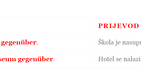1. „gegenüber von“ – Nasuprot nečemu Objašnjenje Označava da se nešto nalazi nasuprot drugog objekta. Uvijek se koristi s dativom. Može stajati iza imenice: „Das Café ist dem Bahnhof gegenüber.“ „Kafić se nalazi nasuprot željezničke stanice.” Struktura gegenüber von + Dativ Alternativno: Subjekt + Dativ + gegenüber Primjeri Njemački Prijevod […]