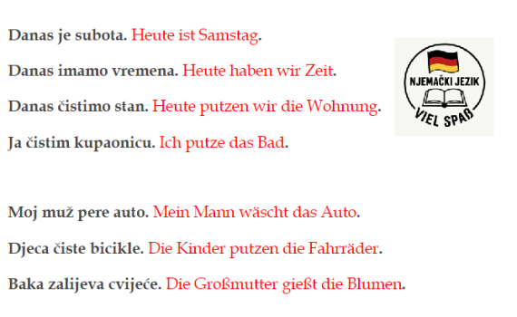 Danas je subota. Heute ist Samstag. Danas imamo vremena. Heute haben wir Zeit. Danas čistimo stan. Heute putzen wir die Wohnung. Ja čistim kupaonicu. Ich putze das Bad. Moj muž pere auto. Mein Mann wäscht das Auto. Djeca čiste bicikle. Die Kinder putzen die Fahrräder. Baka zalijeva cvijeće. […]