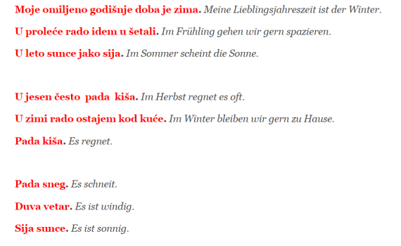 Imenuj godišnja doba: Nenne die Jahreszeiten: Proljeće, ljeto, jesen, zima. Der Frühling, der Sommer, der Herbst und der Winter. Koje je tvoje omiljeno godišnje doba? Welche ist deine Lieblingsjahreszeit? Moje omiljeno godišnje doba je zima. Meine Lieblingsjahreszeit ist der Winter. U proljeće rado idem u šetali. Im Frühling gehen […]