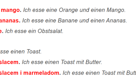 Ja jedem jagodu. Ich esse eine Erdbeere. Ja jedem kiwi i lubenicu. Ich esse eine Kiwi und eine Melone. Ja jedem jabuku i grejp. Ich esse einen Apfel und eine Grapefruit. Ja jedem naranču i mango. Ich esse eine Orange und einen Mango. Ja jedem bananu i ananas. Ich […]