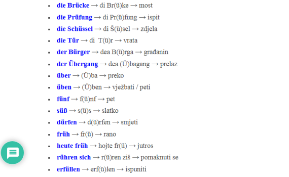 das Stück → das St(ü)k → komad die Brücke → di Br(ü)ke → most die Prüfung → di Pr(ü)fung → ispit die Schüssel → di Š(ü)sel → zdjela die Tür → di T(ü)r → vrata der Bürger → dea B(ü)rga → građanin der Übergang → dea (Ü)bagang → prelaz über […]