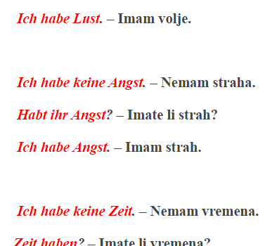 Ich habe keine Lust. – Nemam volje. Wirst haben Lust. – Imate li volje? Ich habe Lust. – Imam volje. Ich habe keine Angst. – Nemam straha. Habt ihr Angst? – Imate li strah? Ich habe Angst. – Imam strah. Ich habe keine Zeit. – Nemam vremena. Zeit […]
