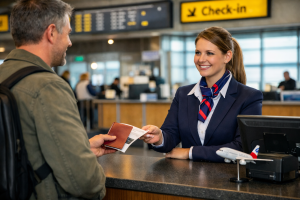 Službenik: Ihr Flug geht um 14 Uhr, das Gate ist Nummer 12.