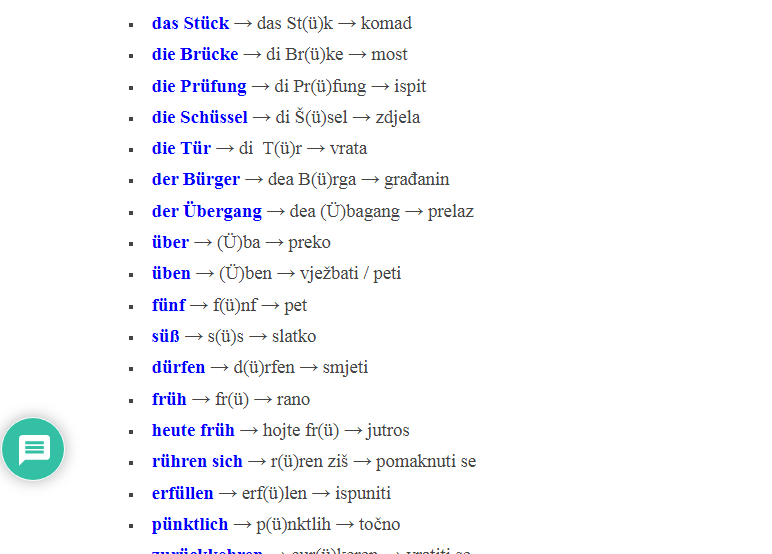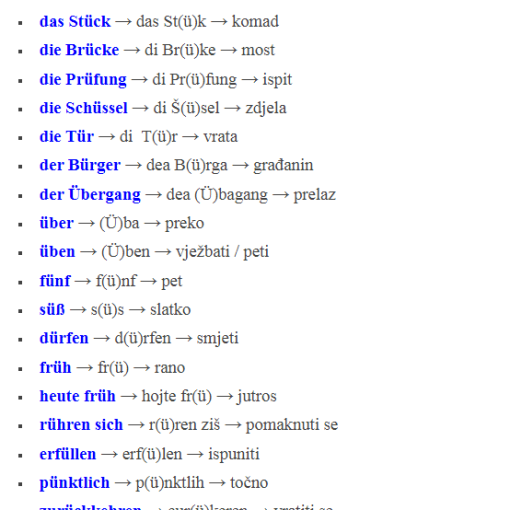 das Stück → das St(ü)k → komad die Brücke → di Br(ü)ke → most die Prüfung → di Pr(ü)fung → ispit die […]