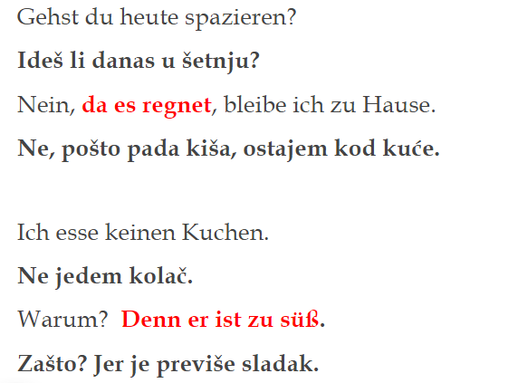 denn | glavna rečenica | glagol odmah iza subjekta | više u govoru | Ich gehe nicht raus, denn es regnet. |